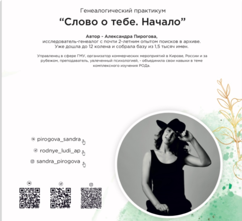 Я - одно из поколений, которое отражено в моем древе. И если я стремлюсь узнать как можно полнее, какой Личностью был каждый мой предок, то этот же принцип я применяю и к себе. Узнавать себя, изучать себя, знакомиться с собой. В том числе через исследование жизней своих предков. Родословная - не блажь и не тренд. Это инвестиция с вполне прагматическими целями. Если вам эта идея подходит - вероятно, мы сработаемся)